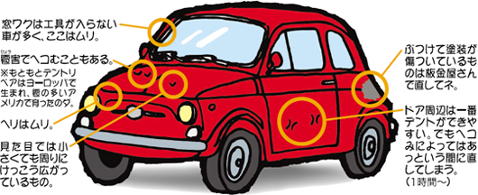 デントリペアとは? 車のボディーの小さなヘコみを特殊な工具を使って直す高度な技術をペイントレスデントリペアと言います。